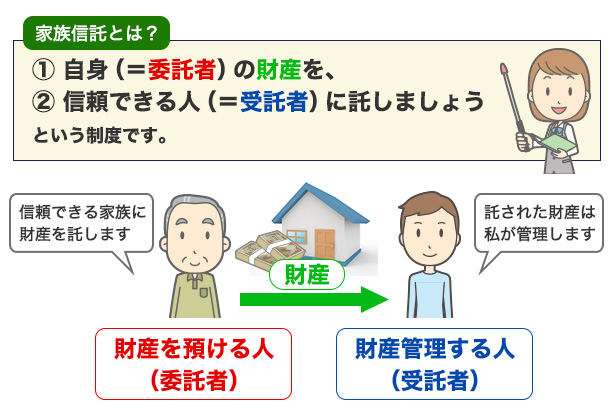 多くの場合、父や母の財産を、子どもや面倒を見ている姪や甥が受託者となり、財産を管理していく制度です。