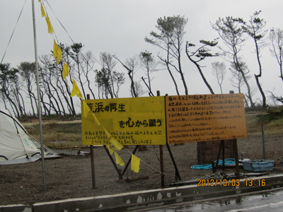 【写真1】街全体が壊滅してしまった仙台市若林区の荒浜地区は、今も無残な光景で、幸せを願う黄色い旗と看板を掲げて、「荒浜の再生を心から願う」と訴えていた。