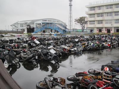 【写真2】黄色い看板のすぐ脇にある荒浜小学校の校庭には、流出した無数のオートバイが集められたままで、崩落した体育館の前も打ち上げられたボートが、そのままの状態に。