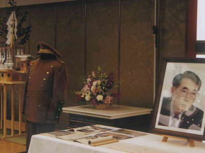 平成25年11月17日、茨城県土浦市のホテルで行われた「持丸博(松浦博)大人命五十日祭、及び偲ぶ会」の祭壇に飾られた①持丸博くんの遺影と、②「楯の会」の血の署名の血判状、③「楯の会」の彼の制服・制帽