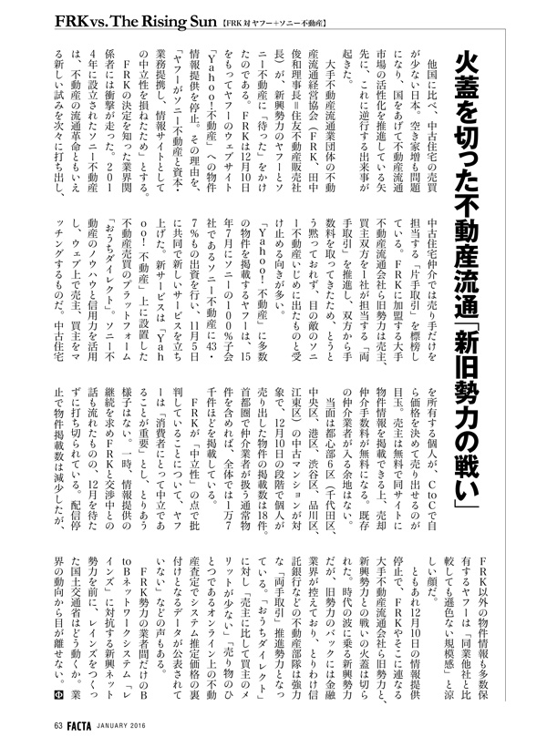 大手不動産流通業団体の不動産流通経営協会(FRK、田中俊和理事長=住友不動産販売社長)が、新興勢力のヤフーとソニー不動産に「待った」をかけたのである。FRKは12月10日をもってヤフーのウェブサイト「Yahoo!不動産」への物件情報提供を停止。その理由を、「ヤフーがソニー不動産と資本・業務提携し、情報サイトとしての中立性を損ねたため」とする。