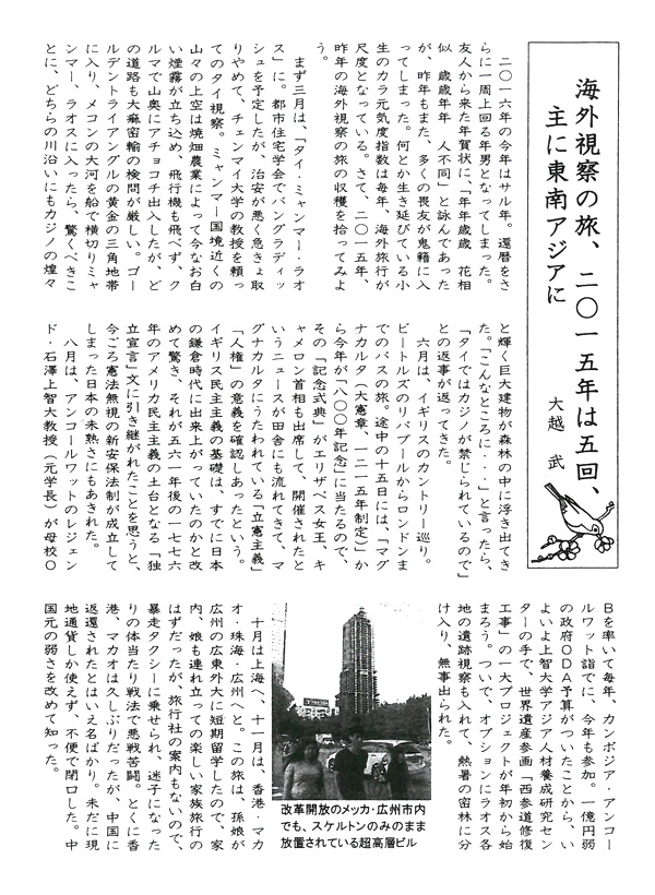 2016年の今年はサル年。還暦をさらに一周上回る年男となってしまった。友人から来た年賀状に、「年年歳歳 花相似 歳歳年年 人不同」と詠んであったが、昨年もまた、多くの畏友が鬼籍に入ってしまった。何とか生き延びている小生のカラ元気度指数は毎年、海外旅行が尺度となっている。さて、2015年、昨年の海外視察の旅の収穫を拾ってみよう。