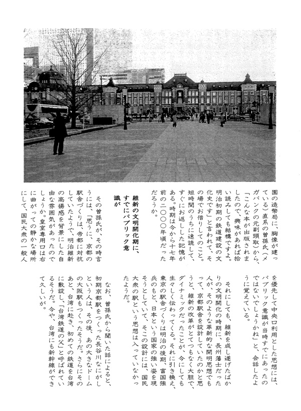 それに対して、「京都の最初の駅舎は、これとは正反対に設計されてつくられた。京都御所からまっすぐの「烏丸通り」正面に駅舎を設けたのはいいが、駅の中央口は一般大衆が乗り降りするところとし、皇室専用口は烏丸通りを右に折れた端部に配置されたので、京都市民からは大変親しまれていた」との趣旨で書かれていたように記憶している。