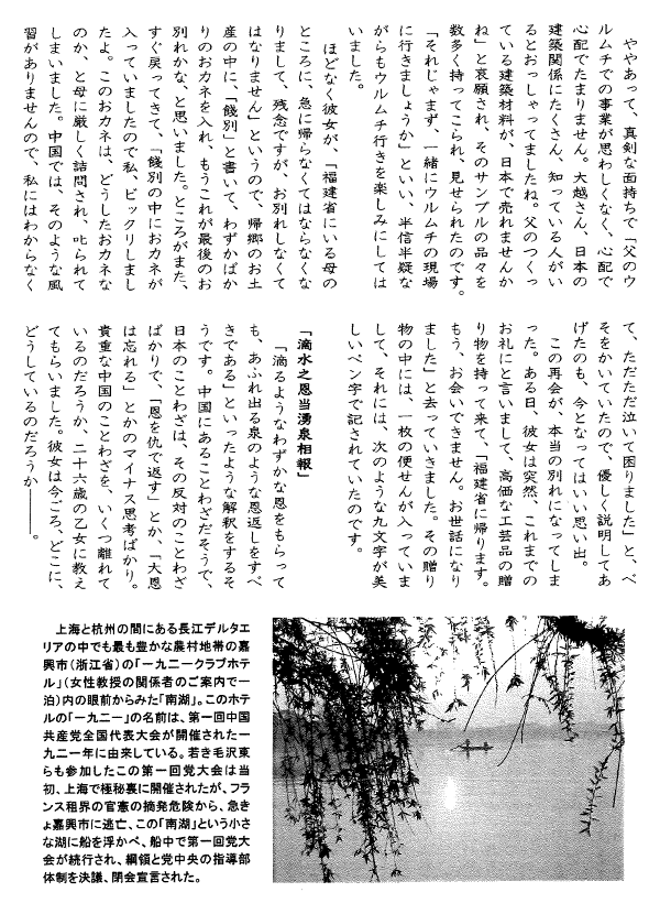 ほどなく彼女が、「福建省にいる母のところに、急に帰らなくてはならなくなりまして、残念ですが、お別れしなくてはなりません」というので、帰郷のお土産の中に、「餞別」と書いて、わずかばかりのおカネを入れ、もうこれが最後のお別れかな、と思いました。ところがまた、すぐ戻ってきて、「餞別の中におカネが入っていましたので私、ビックリしましたよ。このおカネは、どうしたおカネなのか、と母に厳しく詰問され、叱られてしまいました。中国では、そのような風習がありませんので、私にはわからなくて、ただただ泣いて困りました」と、べそをかいていたので、優しく説明してあげたのも、今となってはいい思い出。