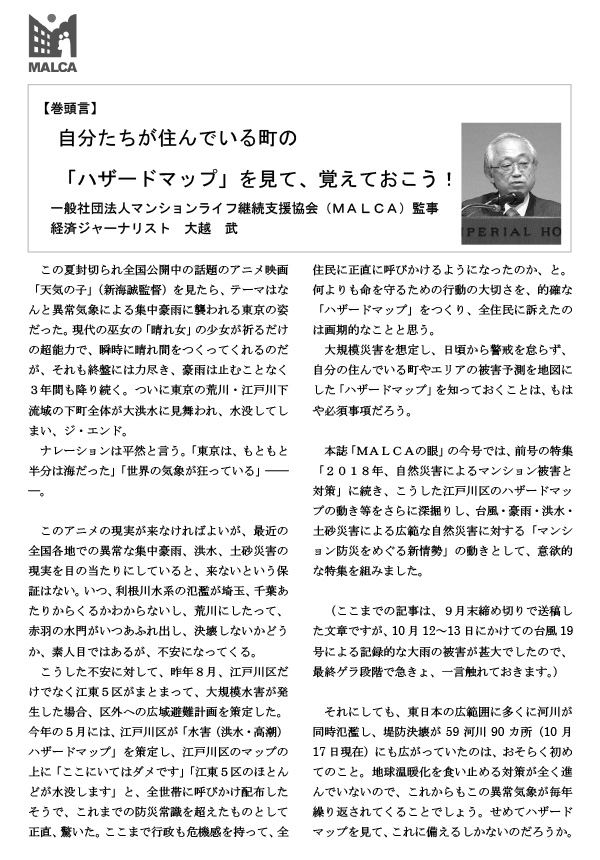 本誌「MALCAの眼」の今号では、前号の特集「2018年、自然災害によるマンション被害と対策」に続き、こうした江戸川区のハザードマップの動き等をさらに深掘りし、台風・豪雨・洪水・土砂災害による広範な自然災害に対する「マンション防災をめぐる新情勢」の動きとして、意欲的な特集を組みました。