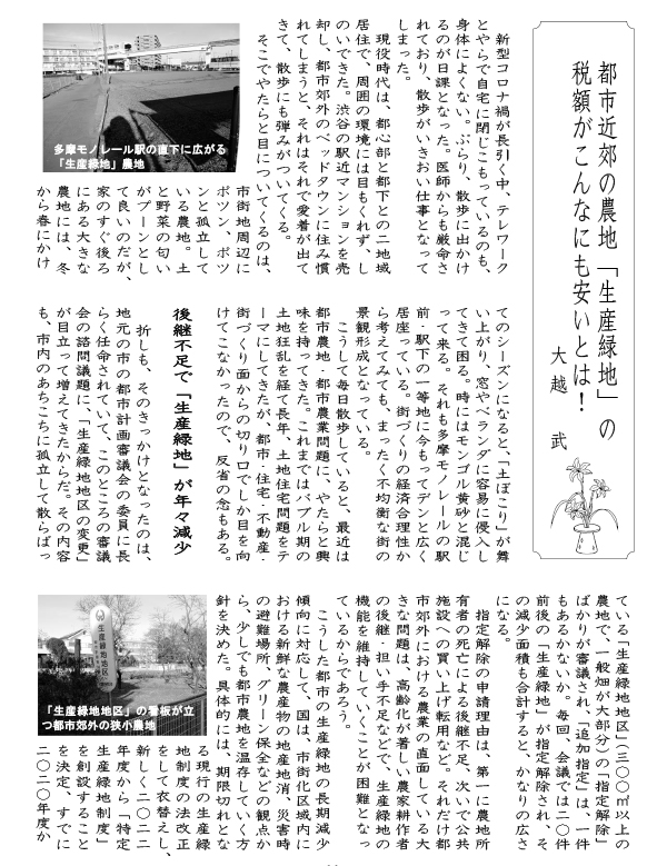 こうして毎日散歩していると、最近は都市農地・都市農業問題に、やたらと興味を持ってきた。これまではバブル期の土地狂乱を経て長年、土地住宅問題をテーマにしてきたが、都市・住宅・不動産・街づくり面からの切り口でしか目を向けてこなかったので、反省の念もある。