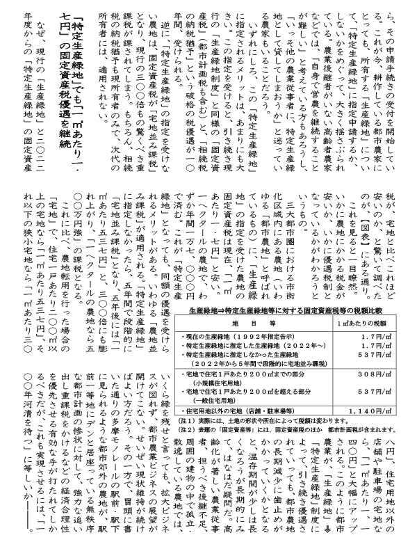 「特定生産緑地」でも「1㎡あたり1.7円」の 固定資産税優遇を継続