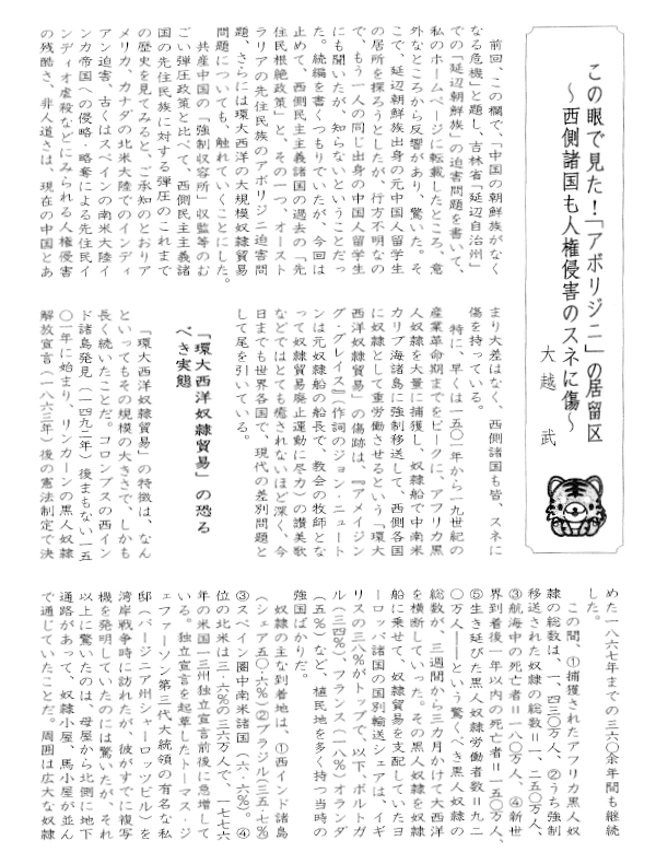 前回、この欄で、「中国の朝鮮族がなくなる危機」と題し、吉林省「延辺自治州」での「延辺朝鮮族」の迫害問題を書いて、私のホームページに転載したところ、意外なところから反響があり、驚いた。そこで、延辺朝鮮族出身の元中国人留学生の居所を探ろうとしたが、行方不明なので、もう一人の同じ出身の中国人留学生にも聞いたが、知らないということだった。続編を書くつもりでいたが、今回は止めて、西側民主主義諸国の過去の「先住民根絶政策」と、その一つ、オーストラリアの先住民族のアボリジニ迫害問題、さらには環大西洋の大規模奴隷貿易問題についても、触れていくことにした。